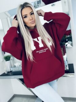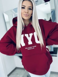 Genialna bluza o oversizowym luźnym kroju która zachwyci Cię swoją jakością i wykończeniem. Uszyta z najwyższej jakości bawełny z ociepleniem idealnie leży i układa się na sylwetce. Bluza z kapturem i kieszonką „kangurka” w najmodniejszym kolorze bordo to zdecydowane połączenie stylu i niezrównanego komfortu.Tkanina z jakiej została uszyta zapewni wygodę przez cały dzień. Bluza z modnym nadrukiem z przodu oraz logo marki MILLAGRO to coś co wyróżnia ją pośród innych modeli. Casualowy styl oraz efektownie dobrana kolorystyka tworzą niebanalny element garderoby, który z pewnością zwróci uwagę.
