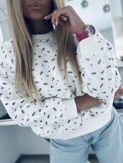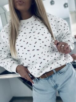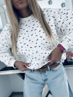 Bluza w rozkoszne drobne kwiatuszki to hit wiosennego sezonu. Model o luźnym kroju uszyty z wysokiej jakości bawełny, pod spodem posiada delikatne ocieplenie.  Wykończony wygodnymi ściągaczami, które zapewniają komfort podczas noszenia. Uroczy powiew świeżości i subtelności który charakteryzuje się przepięknym kwiatowym printem doskonale wpisze się w najnowsze trendy tworząc Twoje stylizacje niezapomnianymi. Bluza ta to unikatowy styl i charakter, dopasujesz ją niemalże ze wszystkim : jeansami, dresami, legginsami i wieloma innymi. Ta bluza to idealna propozycja dla Pań które uwielbiają się wyróżniać w sposób naturalny i subtelny jednocześnie ceniąc sobie jakość i detale.