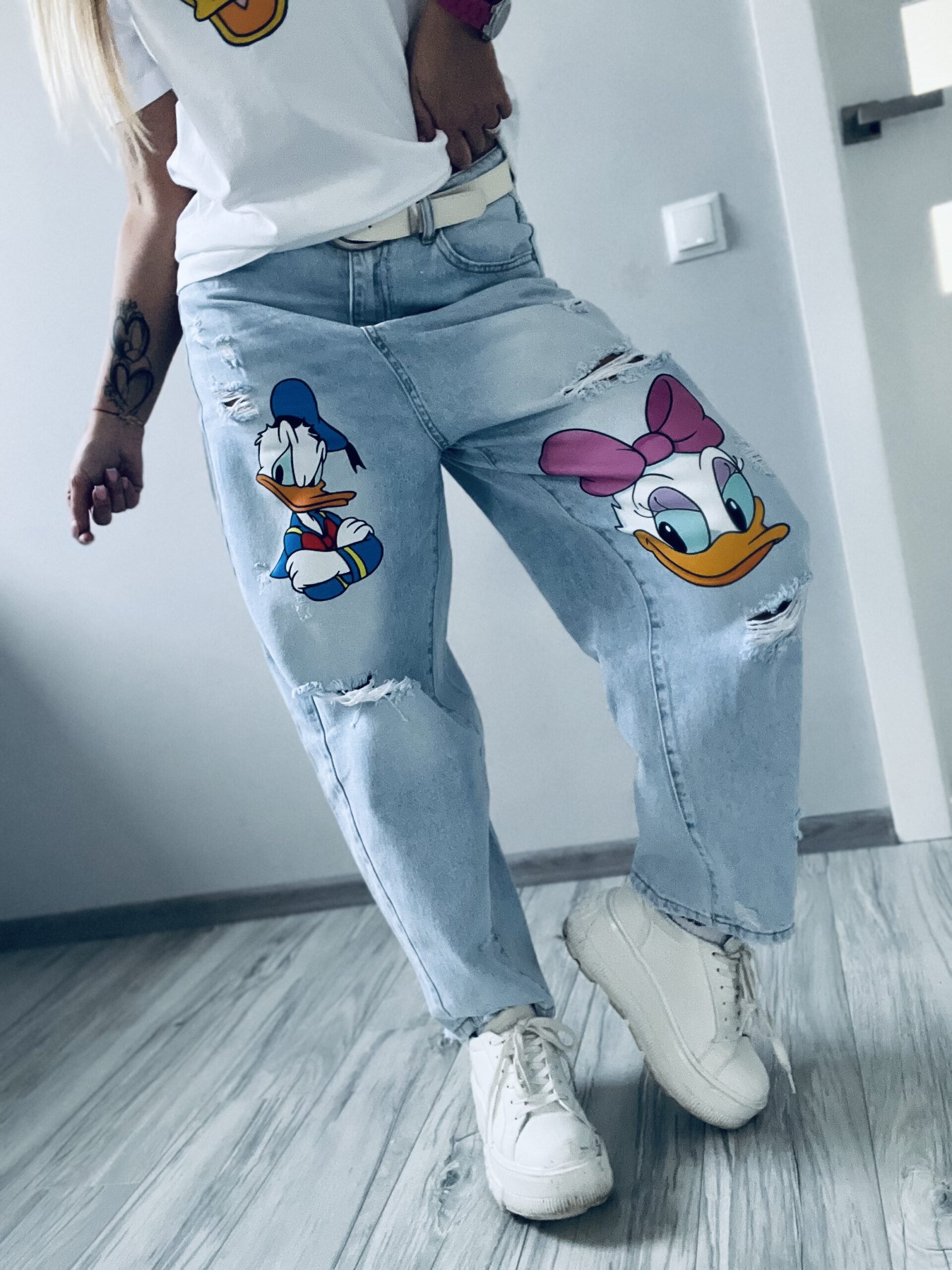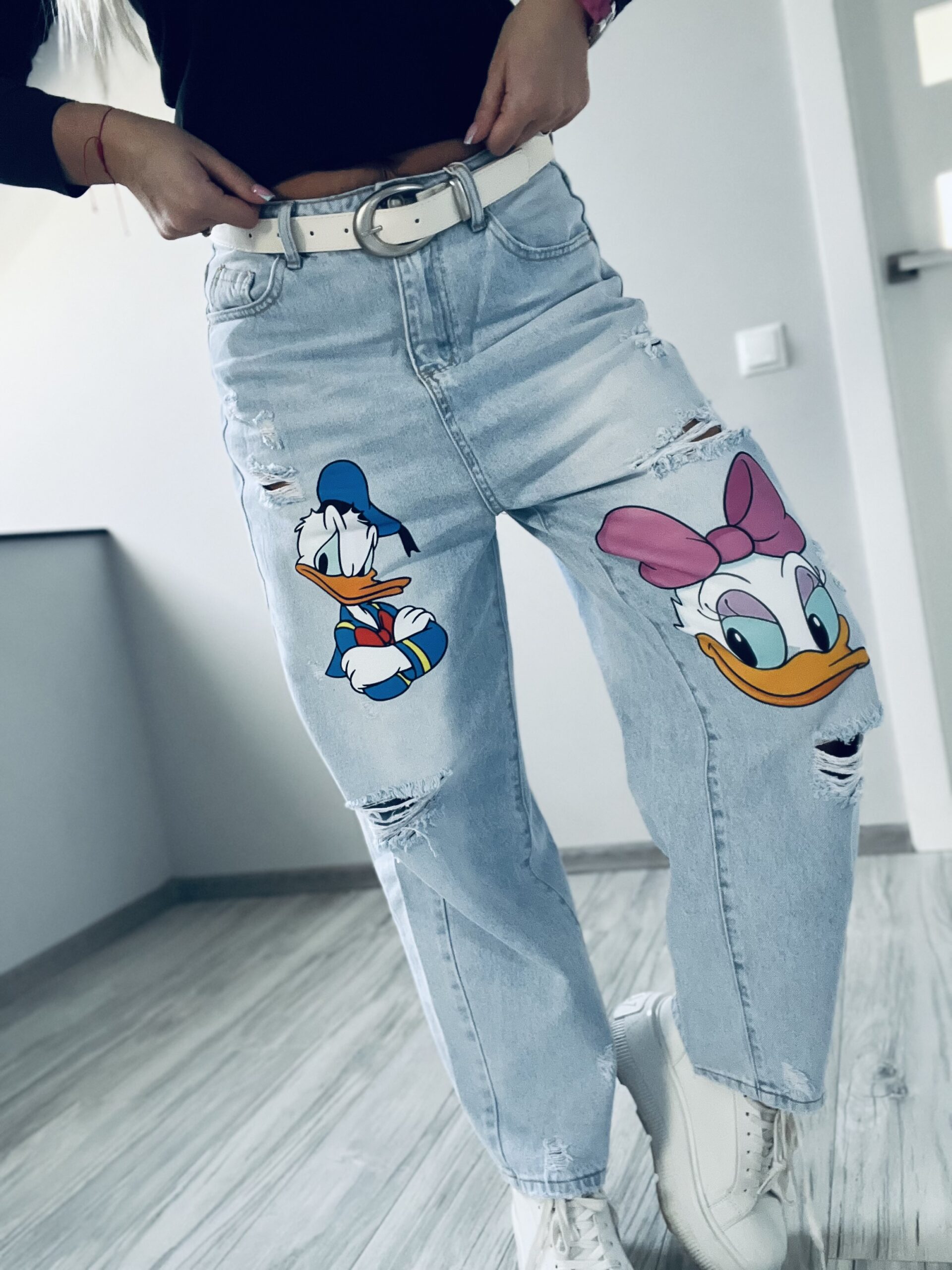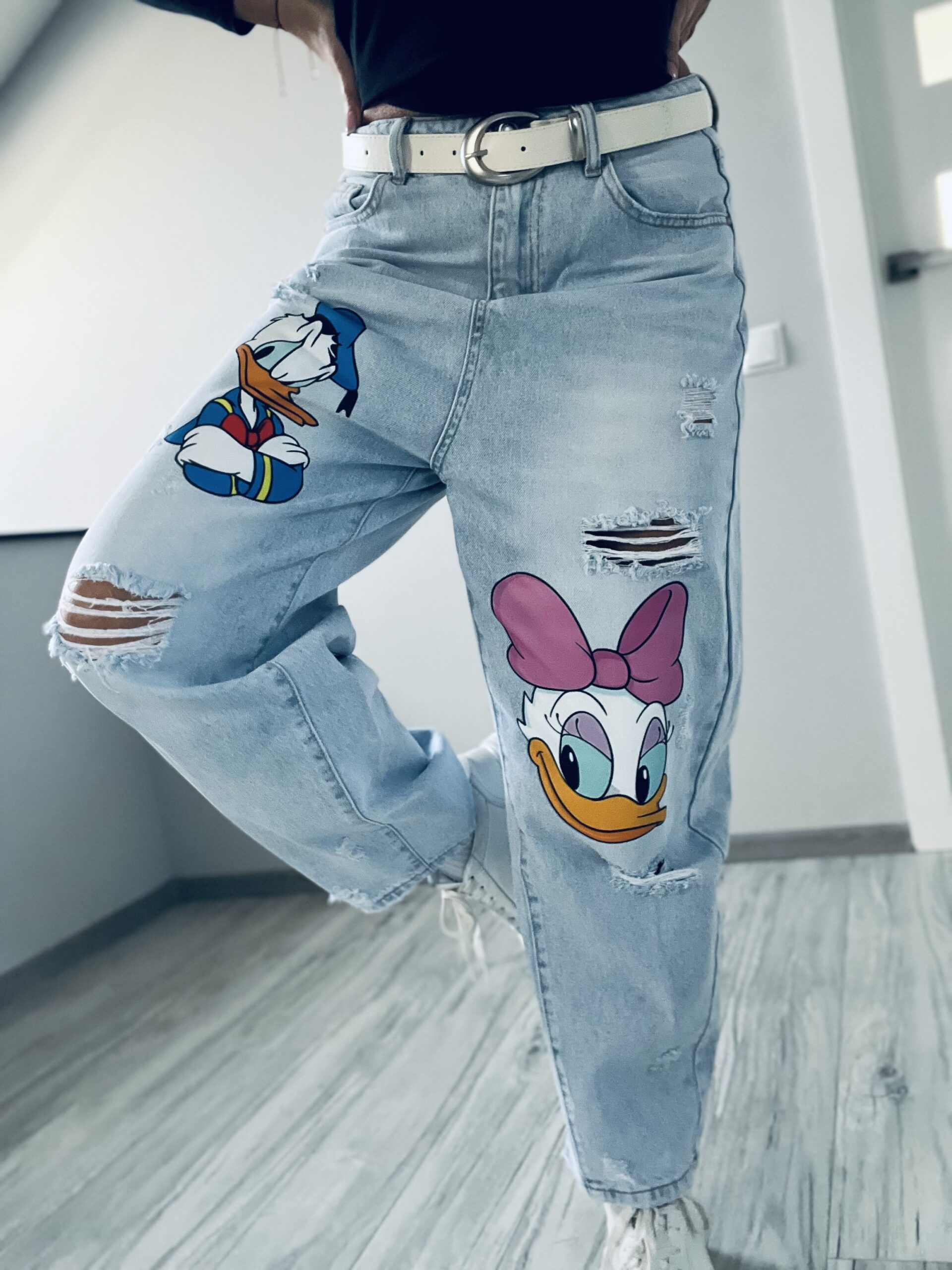 Fantastyczny unikatowy model jeansów z motywem kultowej DAISY i DONALDA. Niesamowicie oryginalne spodnie które już na wejściu robią świetne wrażenie i niezapomniany efekt. Najmodniejszy fason sezonu który pasuje do każdej sylwetki. Wykonane z miękkiego i lekkiego jeansu w jasnym kolorze co przepięknie prezentuje się zwłaszcza wiosną i latem do kolorowych lub białych t-shirtów. Lekkie przetarcia dodają atrakcyjności i jeszcze bardziej dodają pewności siebie. Wygodny a zarazem niespotykany i bardzo wyjątkowy model. Będziesz w nich prezentować się obłędnie i niesamowicie pięknie!