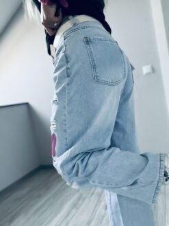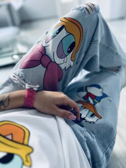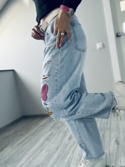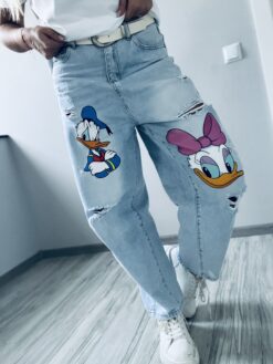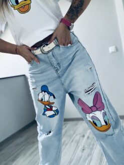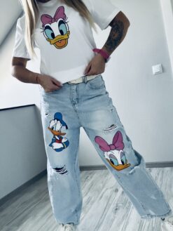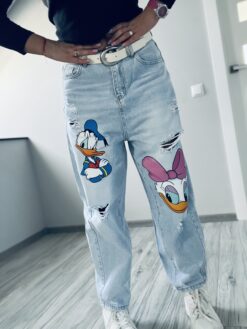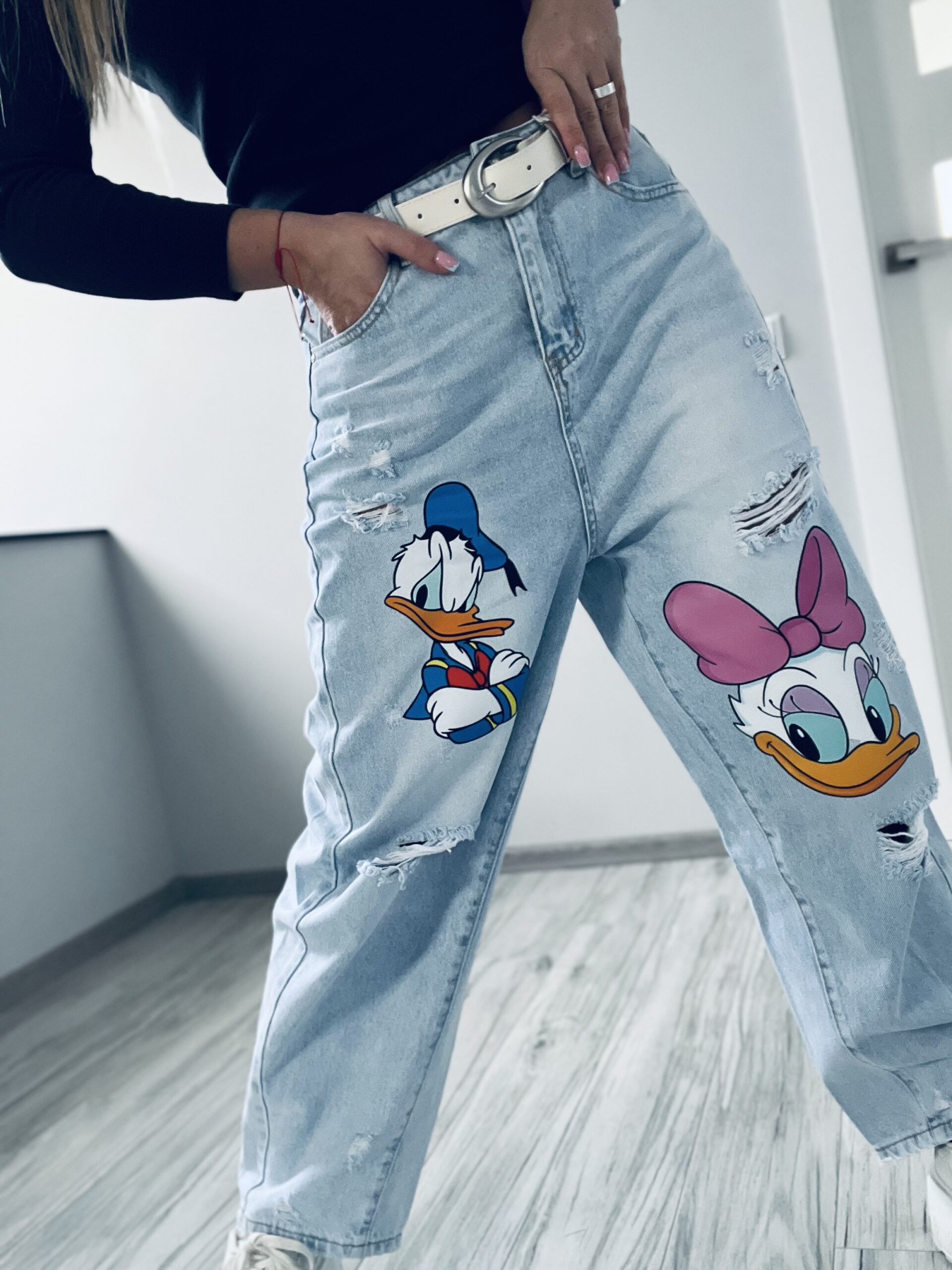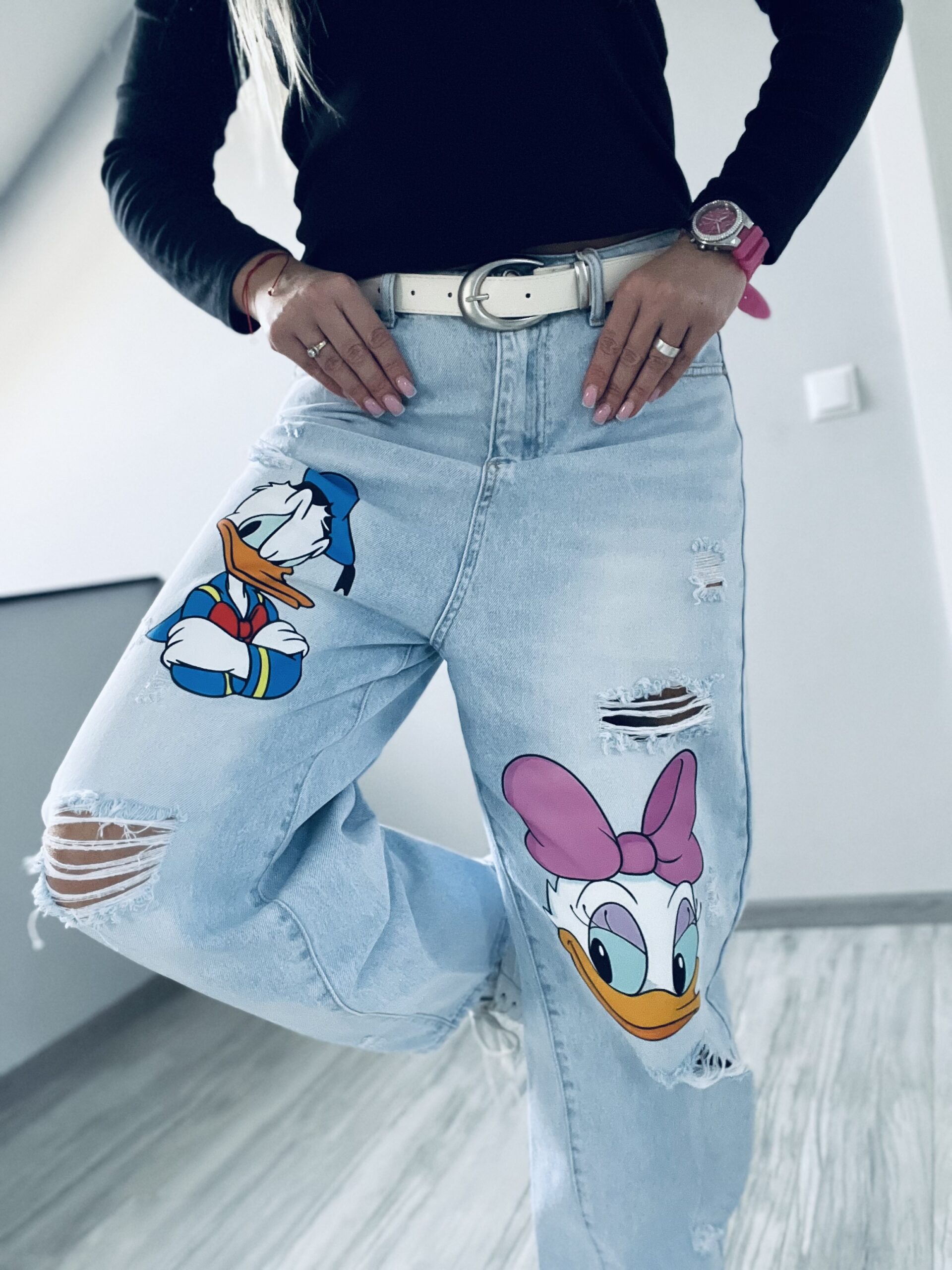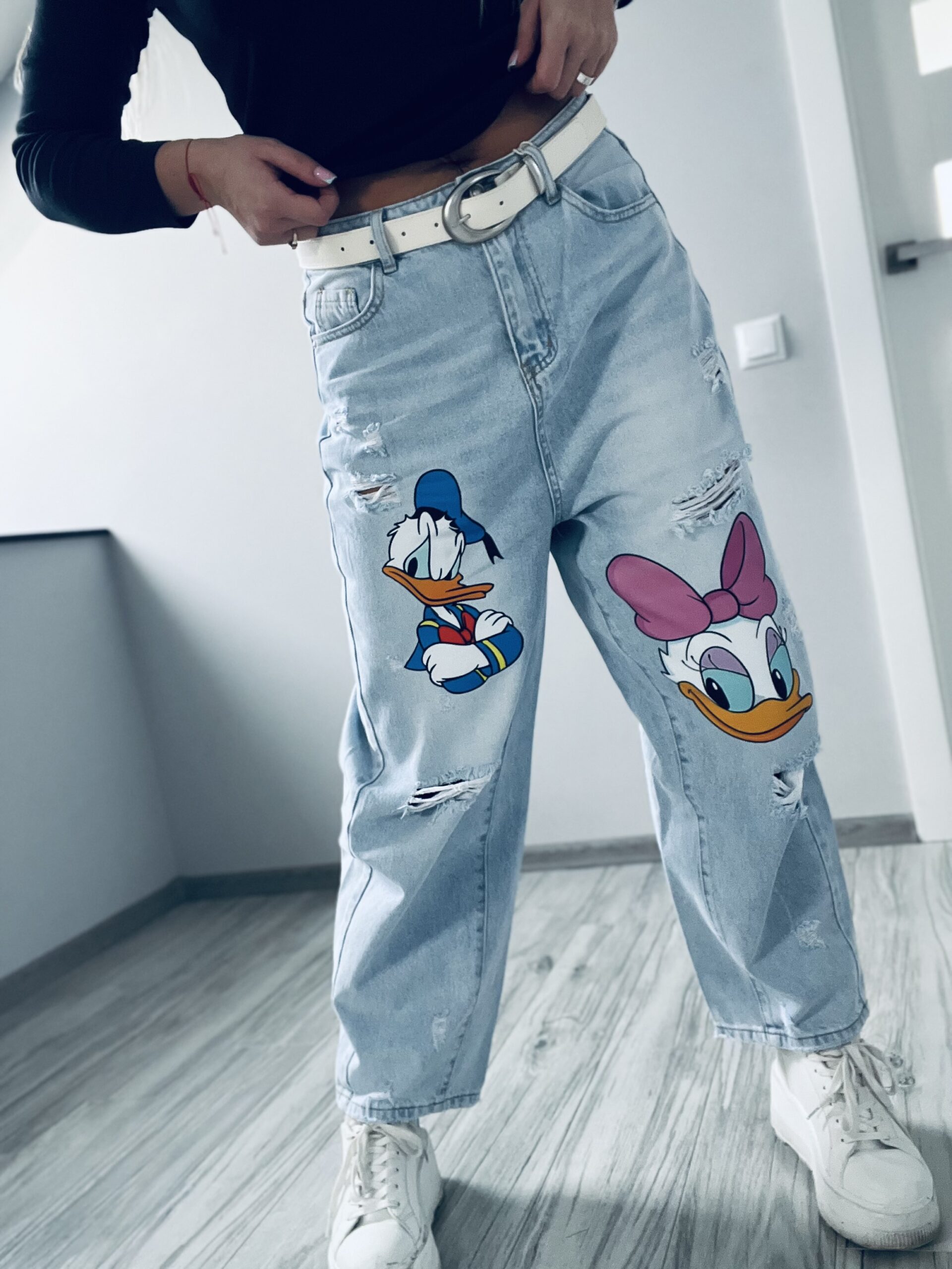 Fantastyczny unikatowy model jeansów z motywem kultowej DAISY i DONALDA. Niesamowicie oryginalne spodnie które już na wejściu robią świetne wrażenie i niezapomniany efekt. Najmodniejszy fason sezonu który pasuje do każdej sylwetki. Wykonane z miękkiego i lekkiego jeansu w jasnym kolorze co przepięknie prezentuje się zwłaszcza wiosną i latem do kolorowych lub białych t-shirtów. Lekkie przetarcia dodają atrakcyjności i jeszcze bardziej dodają pewności siebie. Wygodny a zarazem niespotykany i bardzo wyjątkowy model. Będziesz w nich prezentować się obłędnie i niesamowicie pięknie!