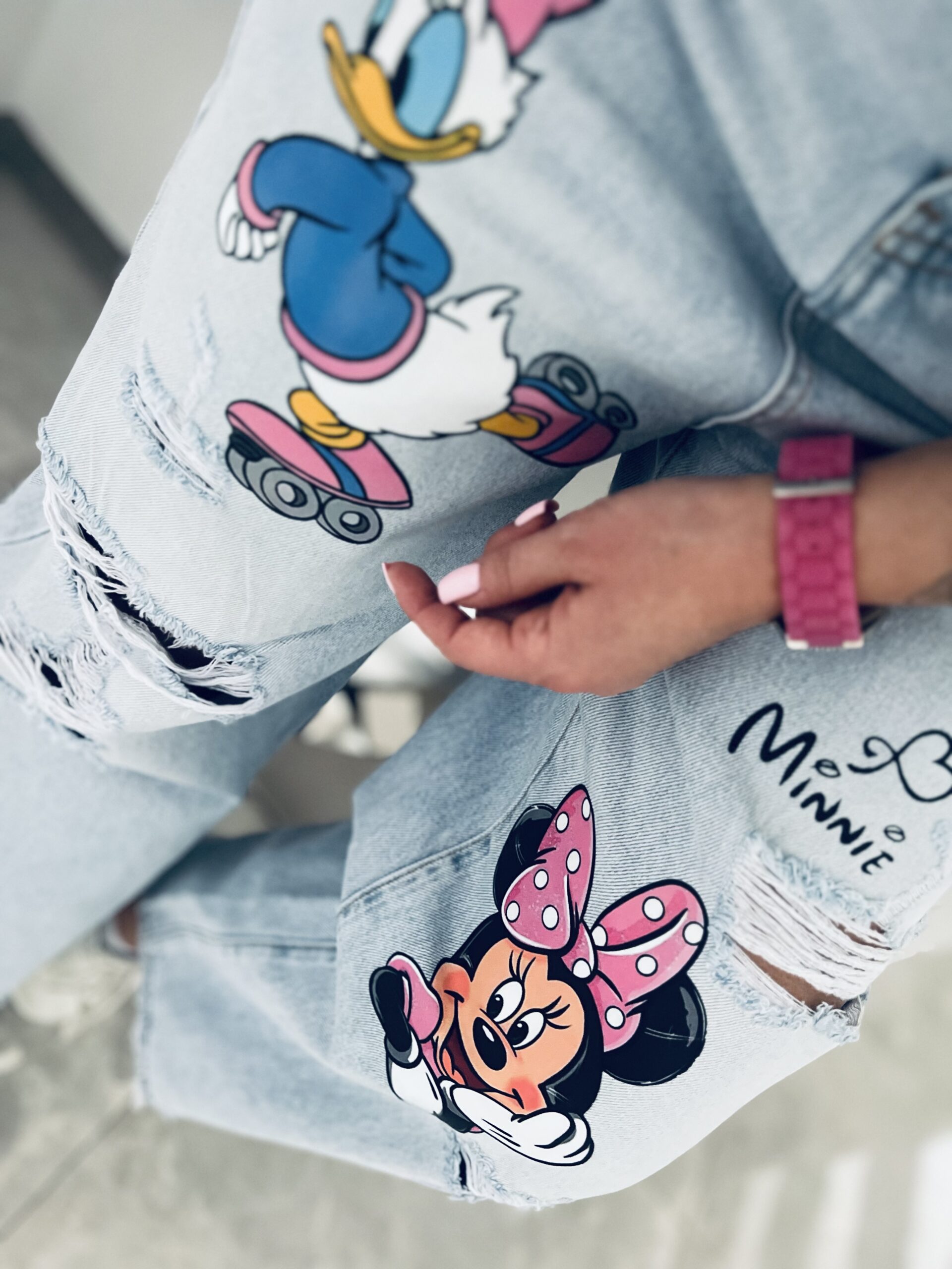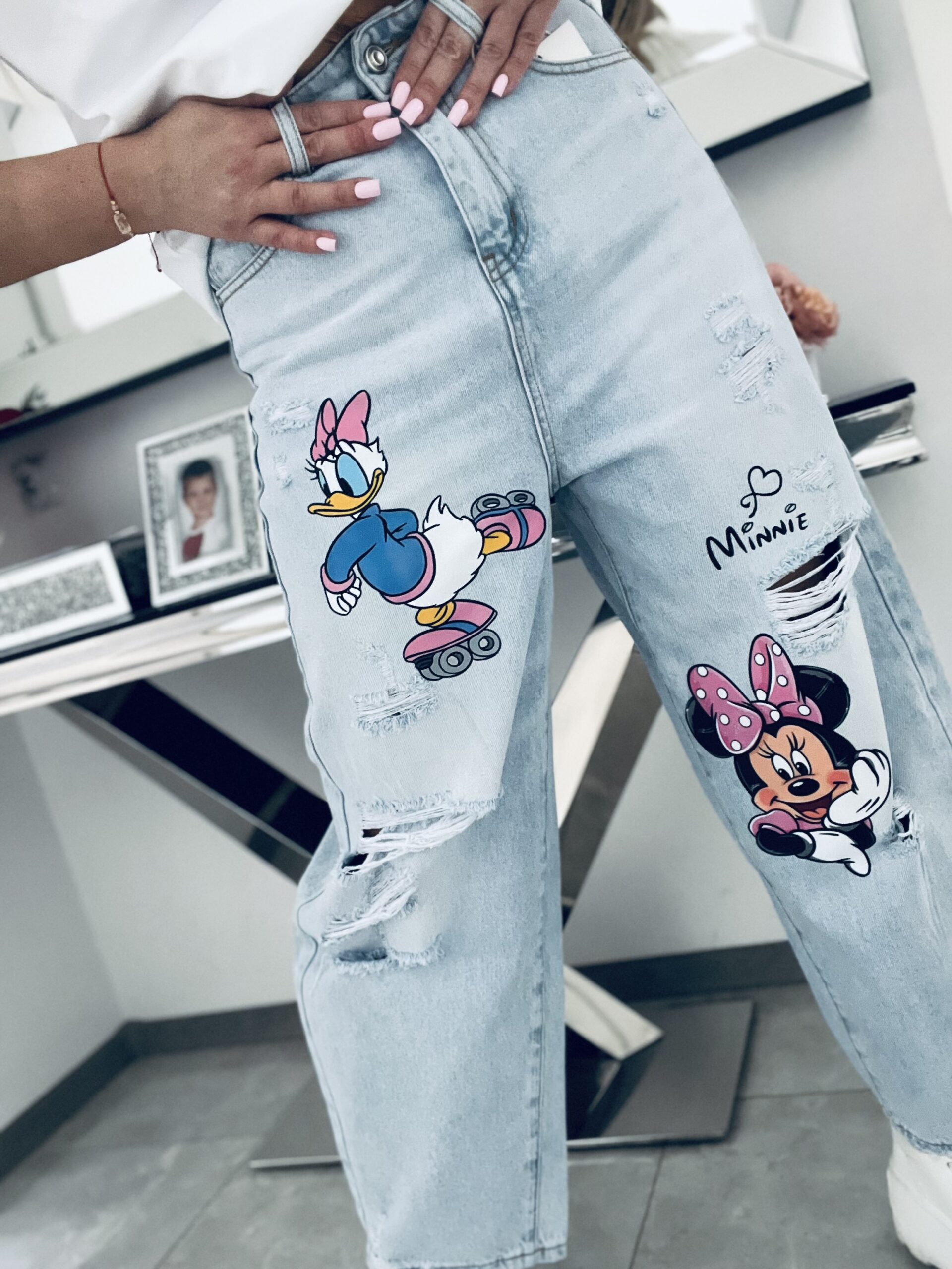 Fantastyczny unikatowy model jeansów z motywem kultowej DAISY i MINNIE . Niesamowicie oryginalne spodnie które już na wejściu robią świetne wrażenie i niezapomniany efekt. Najmodniejszy fason sezonu który pasuje do każdej sylwetki. Wykonane z miękkiego i lekkiego jeansu w jasnym kolorze co przepięknie prezentuje się zwłaszcza wiosną i latem do kolorowych lub białych t-shirtów. Lekkie przetarcia dodają atrakcyjności i jeszcze bardziej dodają pewności siebie. Wygodny a zarazem niespotykany i bardzo wyjątkowy model. Będziesz w nich prezentować się obłędnie i niesamowicie pięknie!