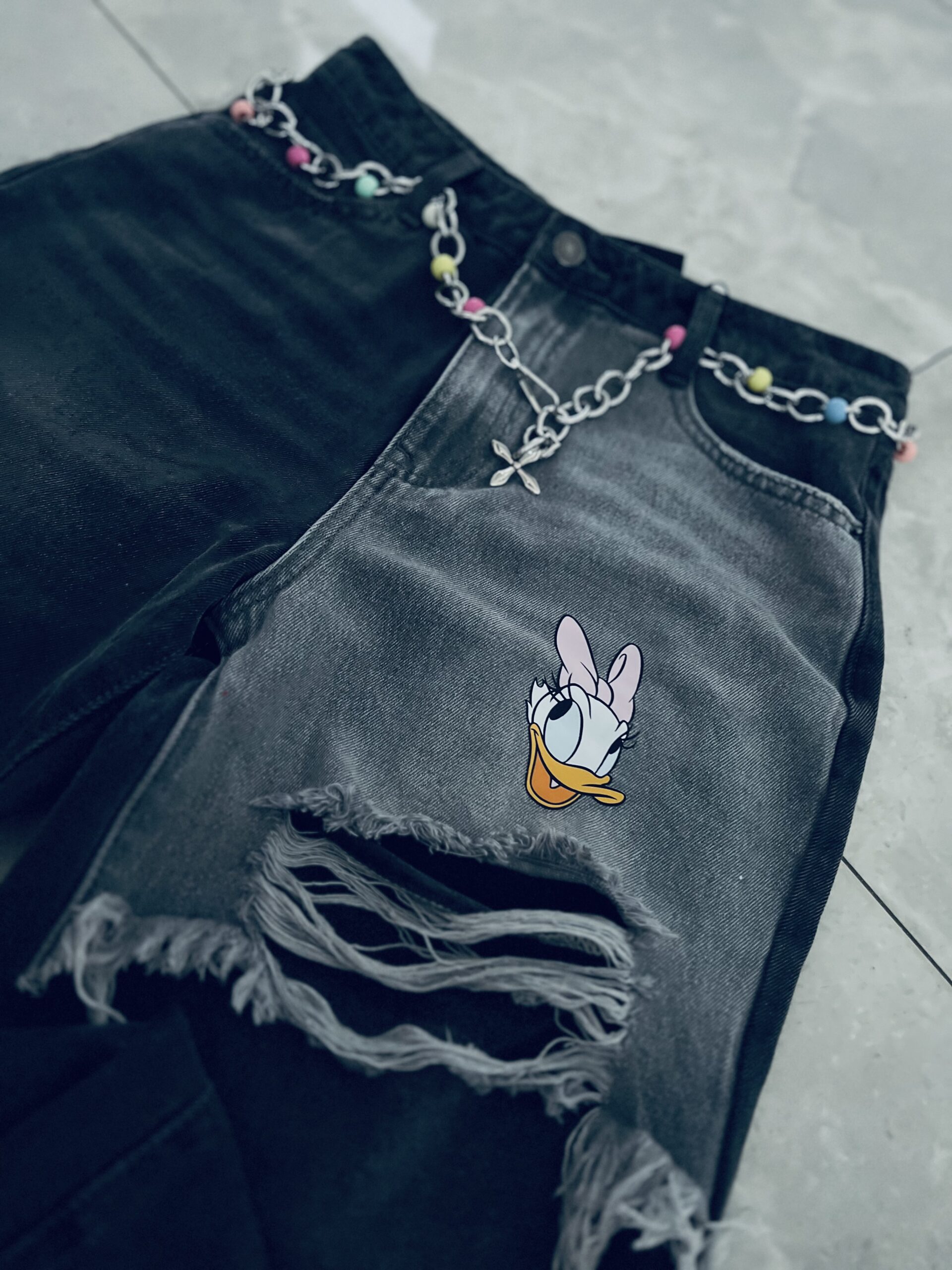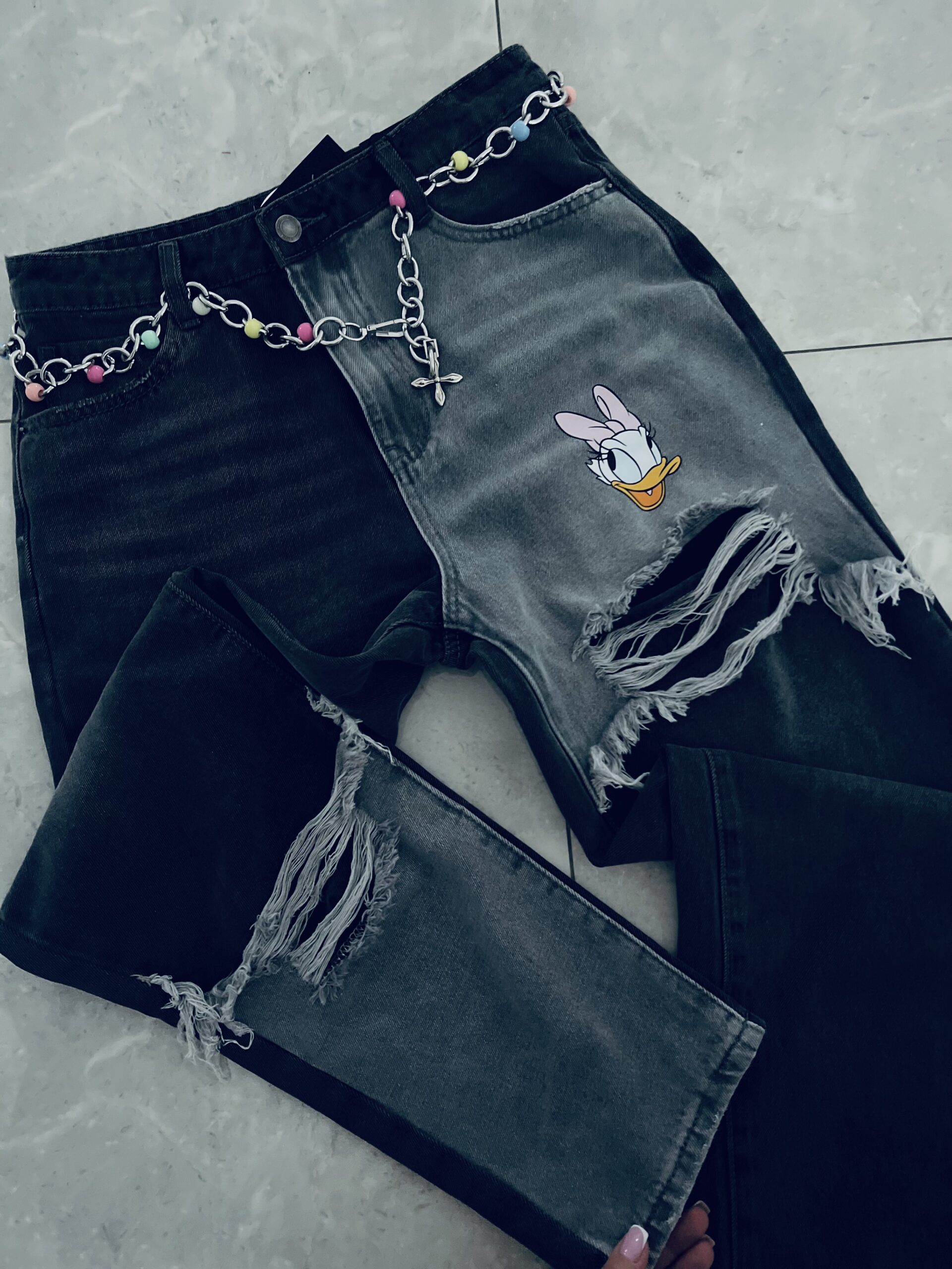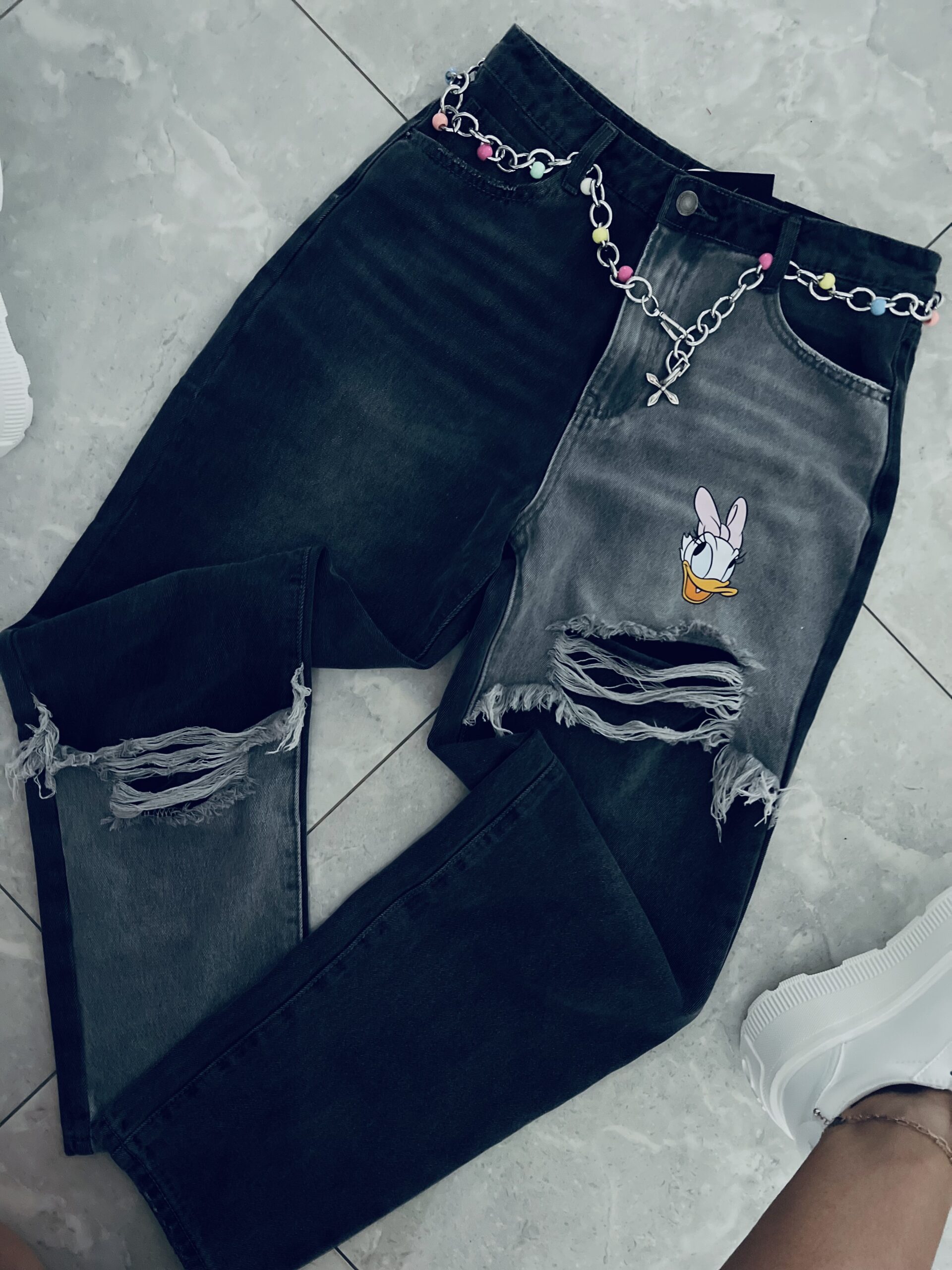 Zjawiskowe spodnie jeansowe z efektownymi przetarciami. Model w kolorze czarno – szarym robi ogromne wrażenie dzięki swojemu unikatowemu wykończeniu . Jeansy o kroju MOM FIT które świetnie leżą i układają się na sylwetce. Doskonały do codziennych i casualowych outfitów . Charakteru dodaje im bajkowy motyw oraz kolorowy łańcuszek w pasie który znajduje się w zestawie . Model nie posiada elastanu lecz mimo to jest miękki i wygodny, co zapewnia wygodę i komfort w noszeniu .