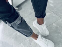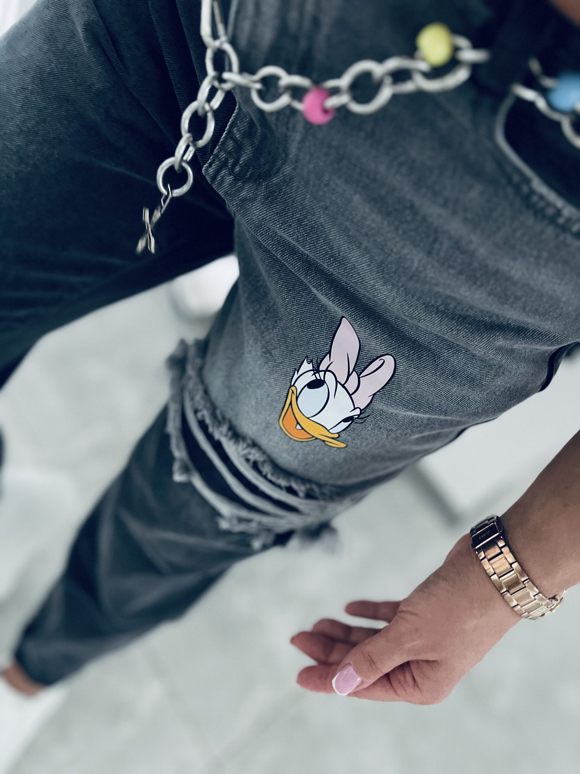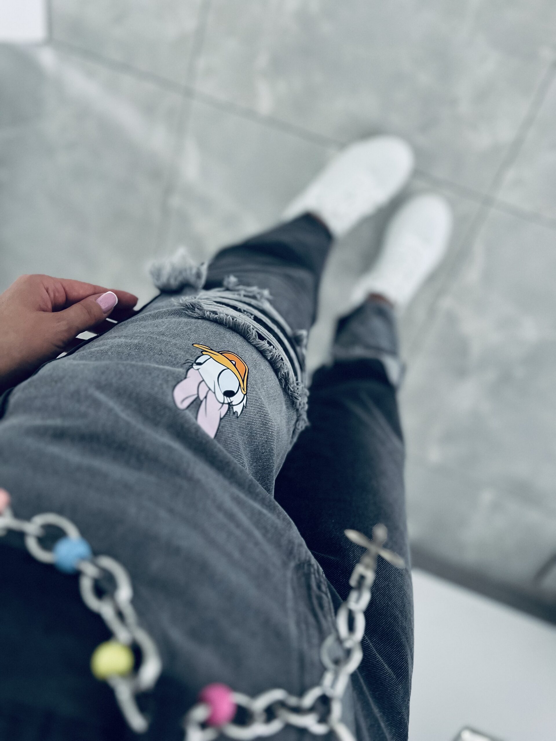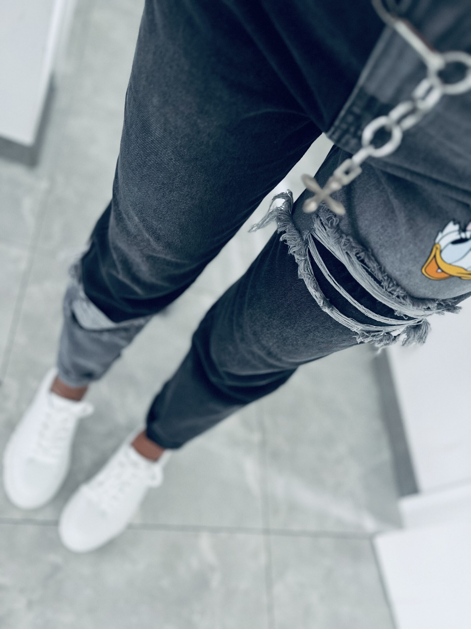 Zjawiskowe spodnie jeansowe z efektownymi przetarciami. Model w kolorze czarno – szarym robi ogromne wrażenie dzięki swojemu unikatowemu wykończeniu . Jeansy o kroju MOM FIT które świetnie leżą i układają się na sylwetce. Doskonały do codziennych i casualowych outfitów . Charakteru dodaje im bajkowy motyw oraz kolorowy łańcuszek w pasie który znajduje się w zestawie . Model nie posiada elastanu lecz mimo to jest miękki i wygodny, co zapewnia wygodę i komfort w noszeniu .