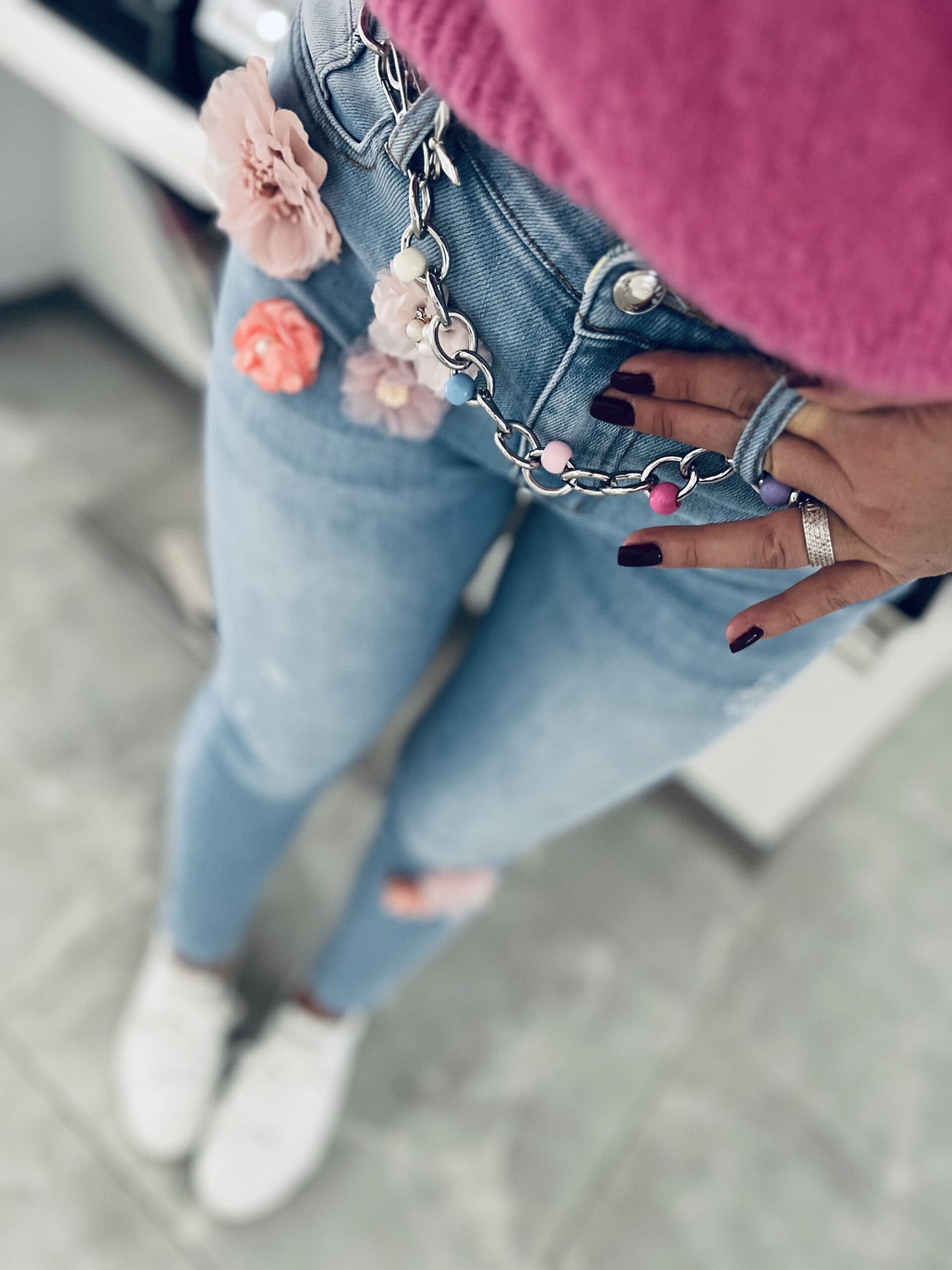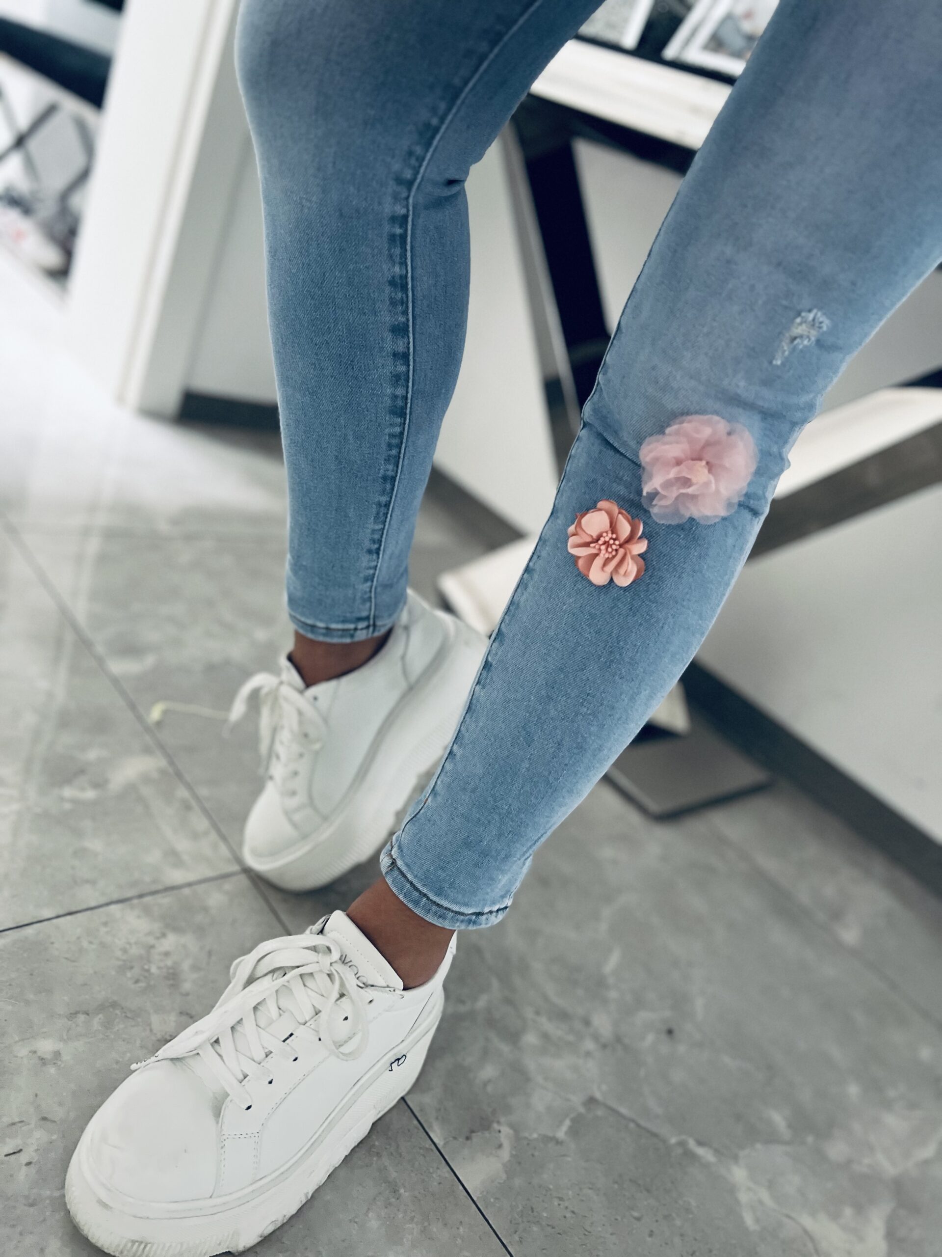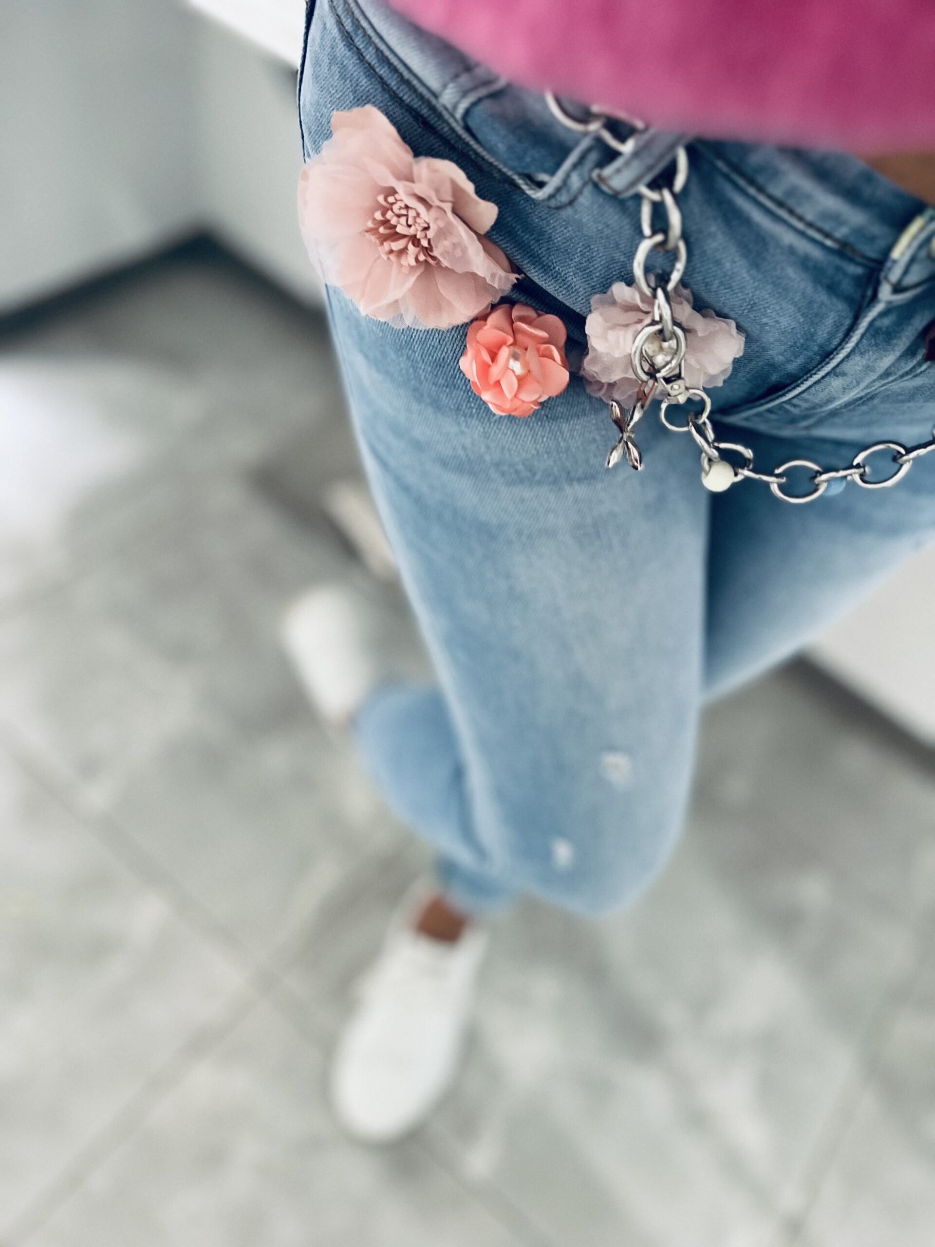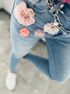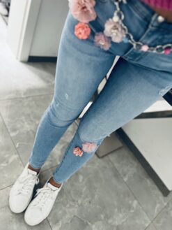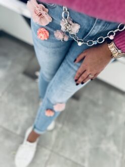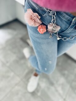 wykonany z wygodnego i elastycznego jeansu który świetnie się dopasowuje i leży na sylwetce.Charakterystycznym elementem tego modelu są przepiękne różowe kwiaty na przodzie nogawek. Idealnie skomponowane robią ogromne wrażenie. Model z paskiem w zestawie w przepięknym odcieniu jeansu. Świetna baza do mnóstwa stylówek !