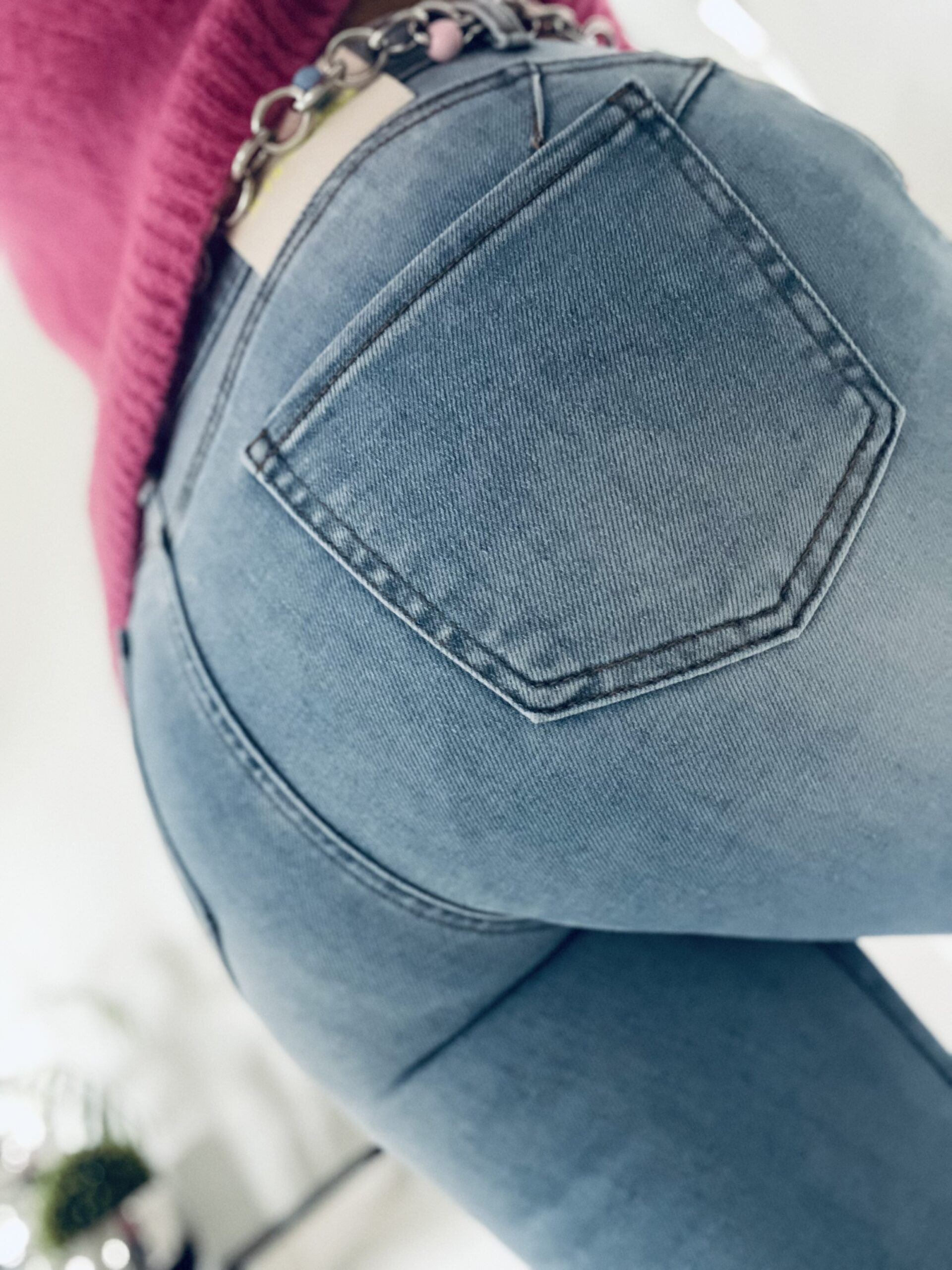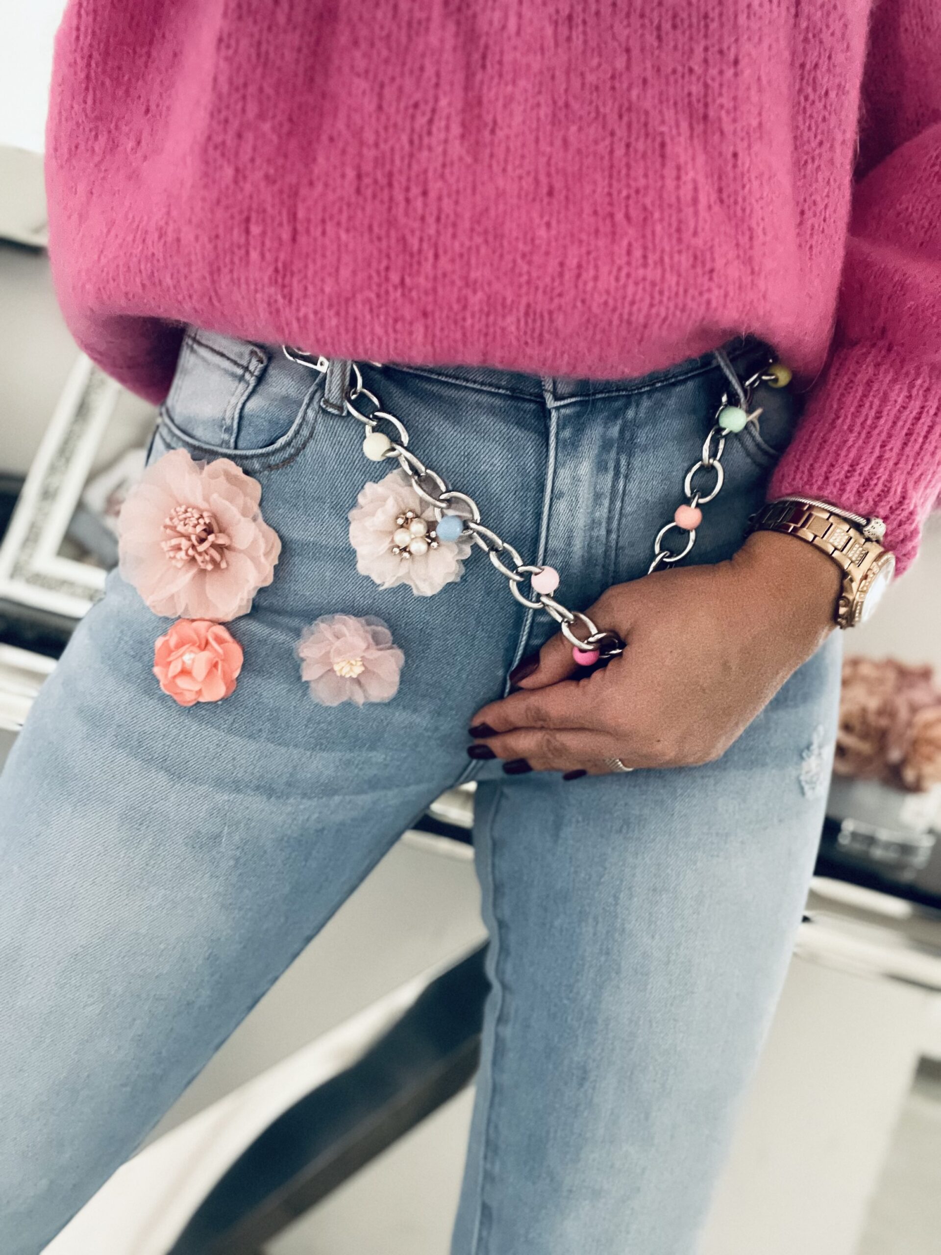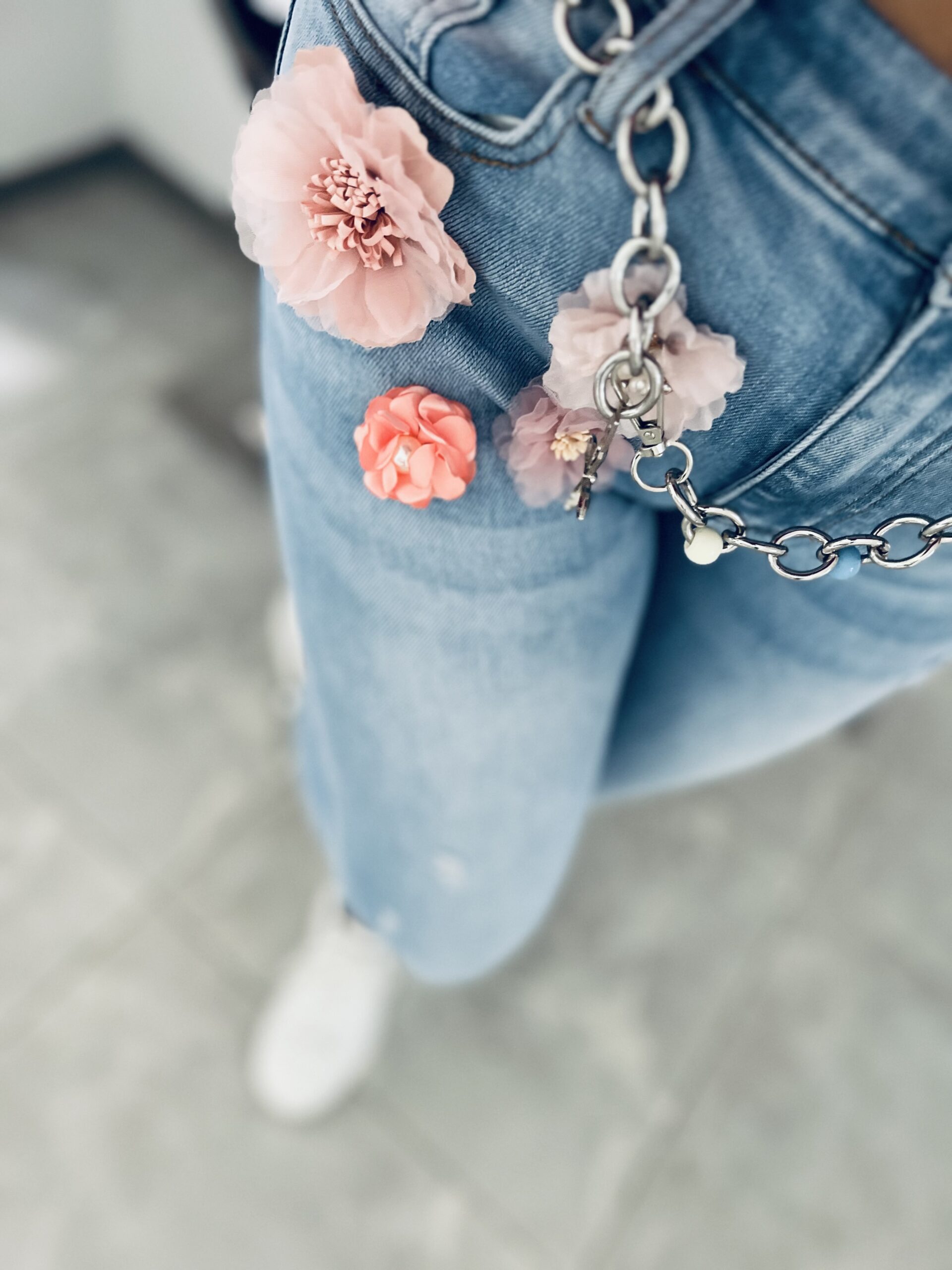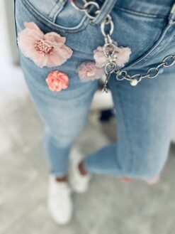 wykonany z wygodnego i elastycznego jeansu który świetnie się dopasowuje i leży na sylwetce.Charakterystycznym elementem tego modelu są przepiękne różowe kwiaty na przodzie nogawek. Idealnie skomponowane robią ogromne wrażenie. Model z paskiem w zestawie w przepięknym odcieniu jeansu. Świetna baza do mnóstwa stylówek !
