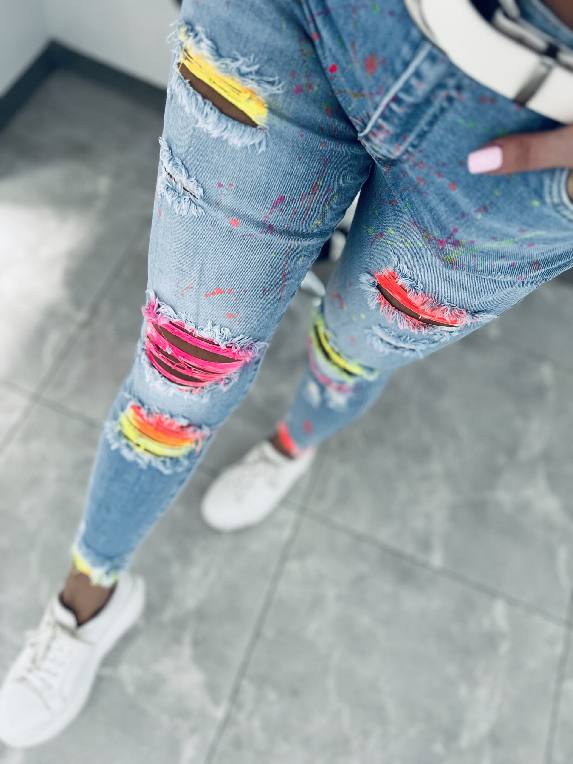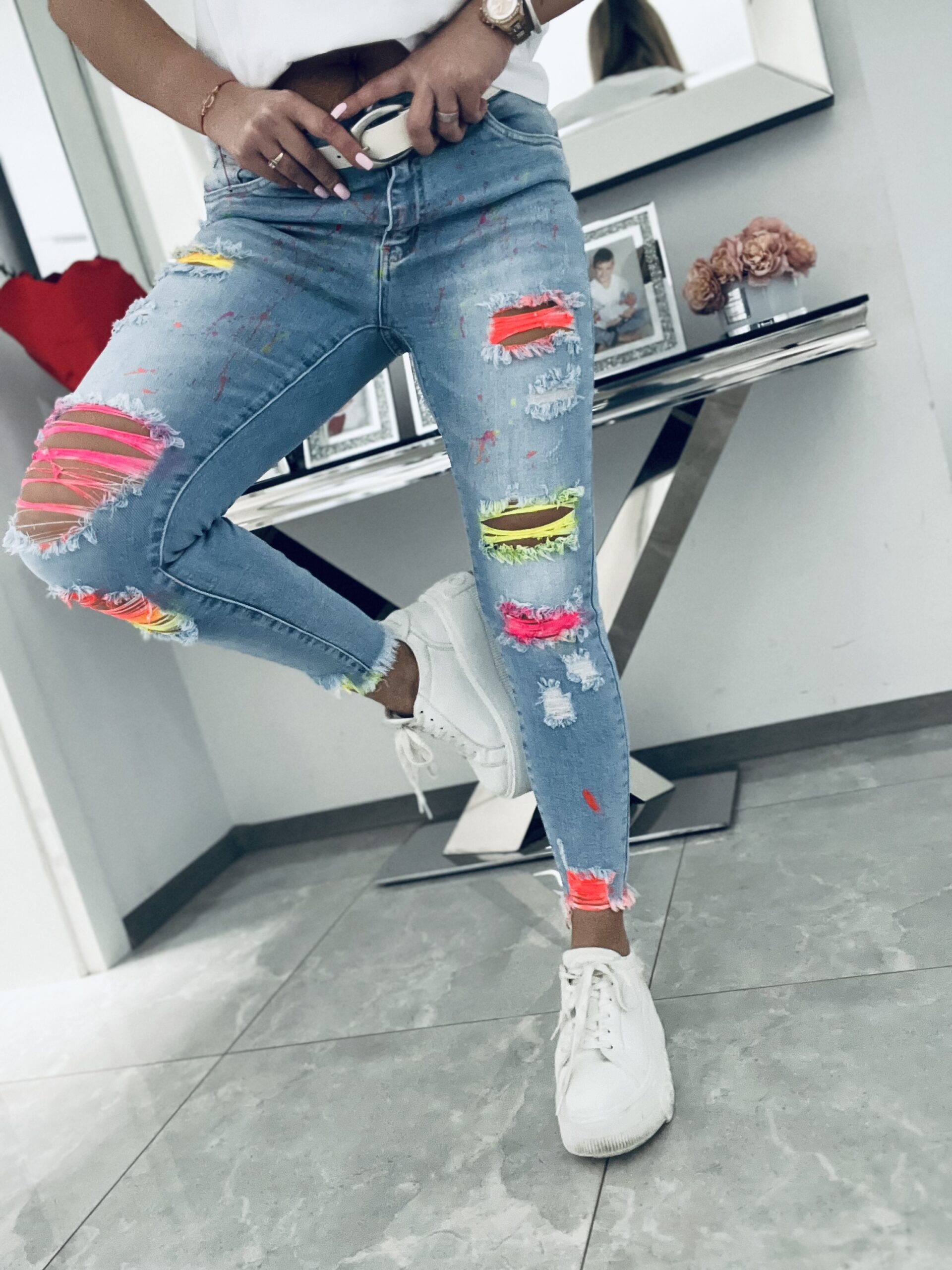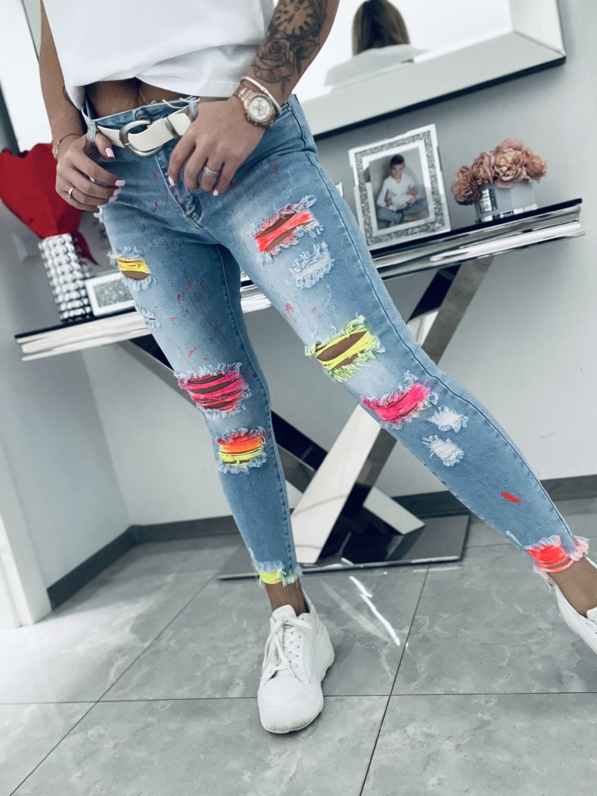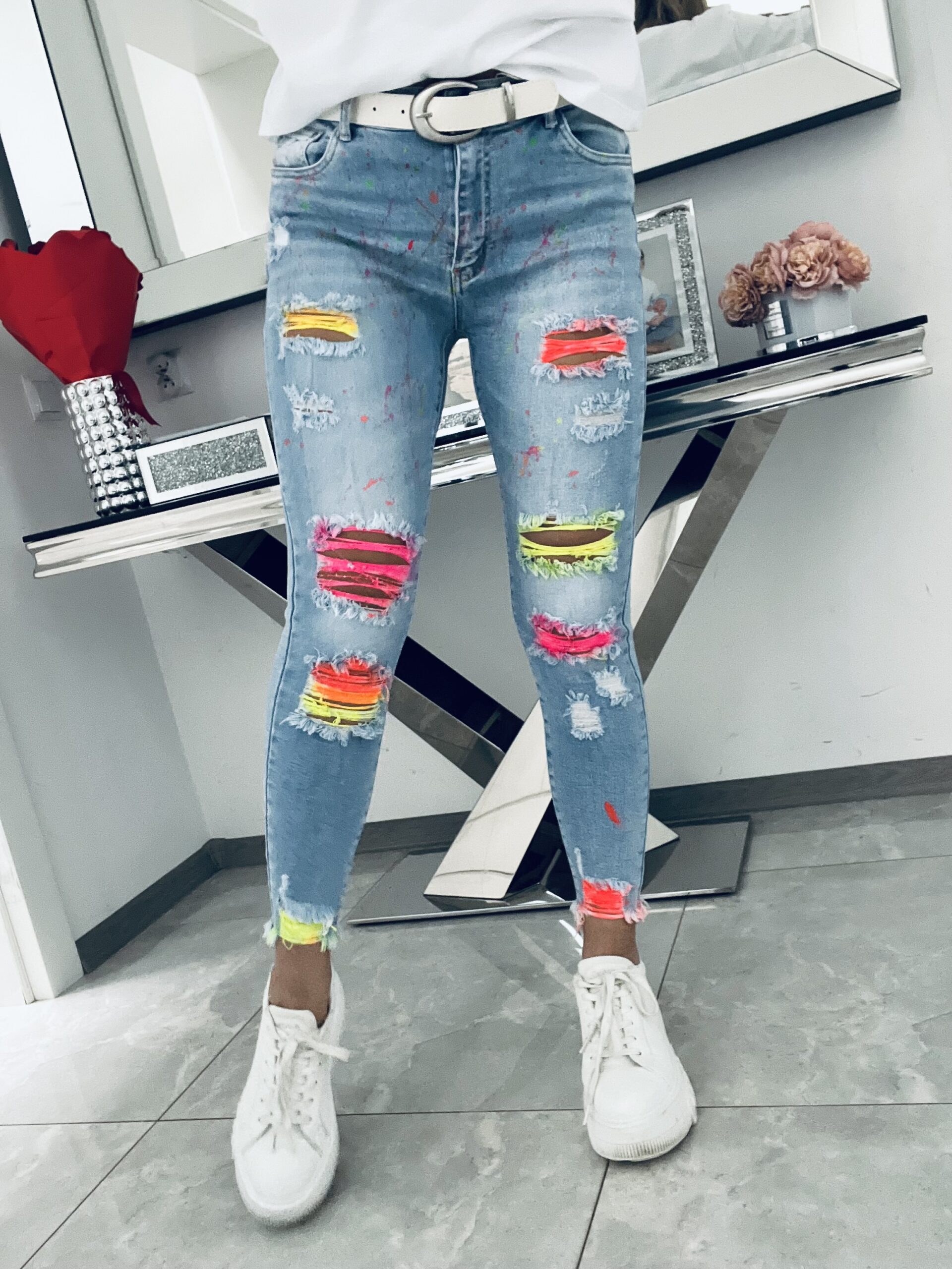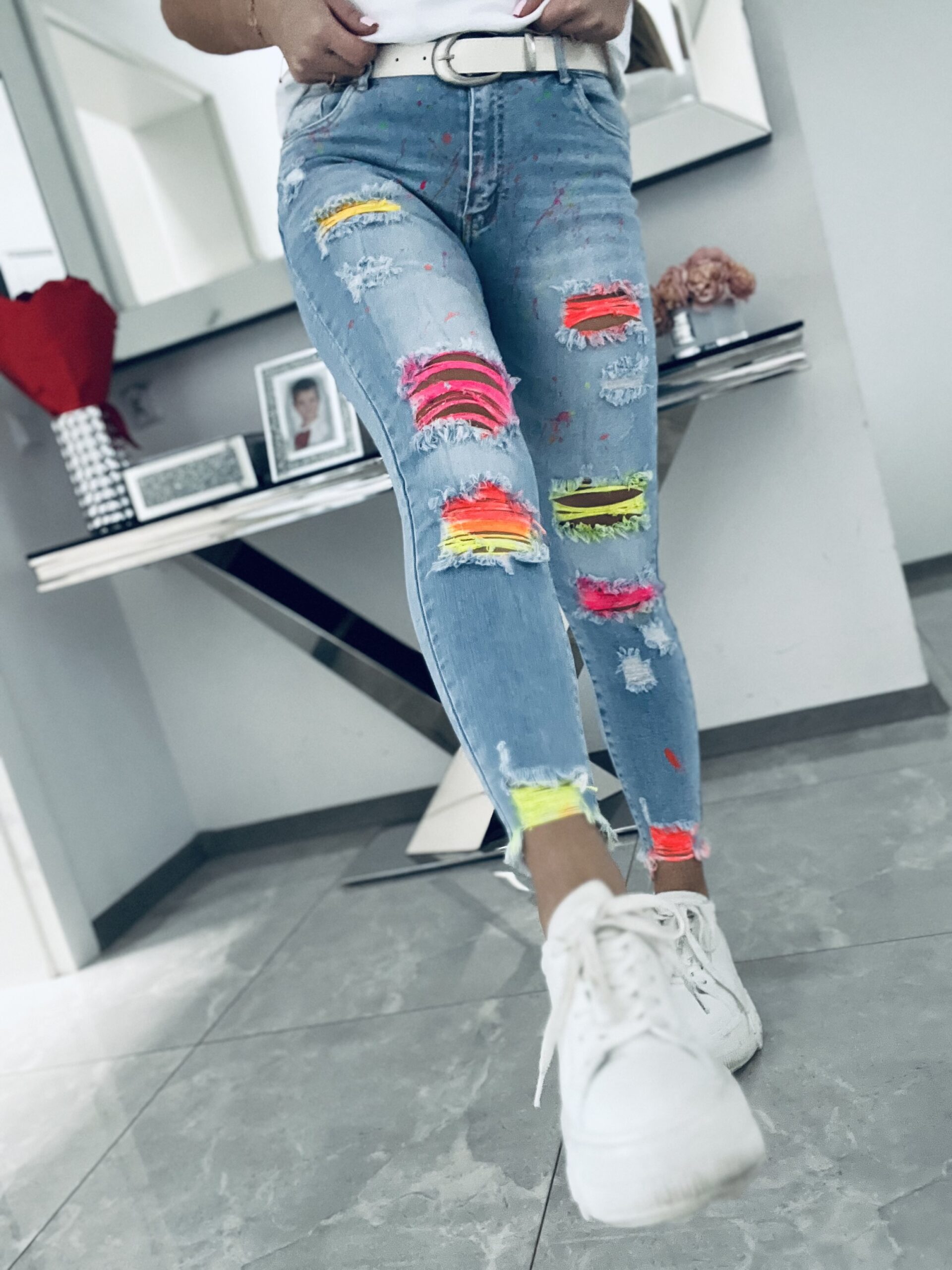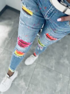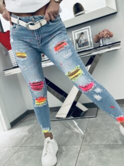 Unikatowy model jeansów o dopasowanym kroju. Stylowe i bardzo oryginalne. Wykonane z miękkiego elastycznego jeansu które świetnie układają się i leżą tworząc tym samym idealne smukłą sylwetkę. Jeansy w niesamowicie dziewczęcej odsłonie zrobią ogromne wrażenie kiedy je założysz. Wyróżniające się przetarcia w neonach stanowią efektowny i niepowtarzalny element. Dodatkowo przód został minimalistycznie i delikatnie nakropiony neonami co prezentuje się niesamowicie pięknie.