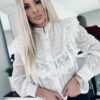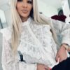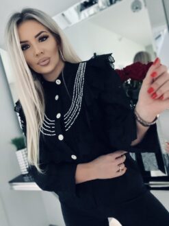 Koszula z uroczą falbanką oraz drobnymi misternymi perłami z przodu wprowadzają oryginalny akcent a biżuteryjne guziki na które jest zapinana dodaje całości wyjątkowej nuty. Uszyta z największą precyzją i dbałością o każdy szczegół a dzięki swojemu misternemu wykonaniu nadaje „efektu wow” każdej nawet najprostszej stylizacji