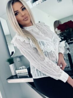 Koszula z uroczą falbanką oraz drobnymi misternymi perłami z przodu wprowadzają oryginalny akcent a biżuteryjne guziki na które jest zapinana dodaje całości wyjątkowej nuty. Uszyta z największą precyzją i dbałością o każdy szczegół a dzięki swojemu misternemu wykonaniu nadaje „efektu wow” każdej nawet najprostszej stylizacji