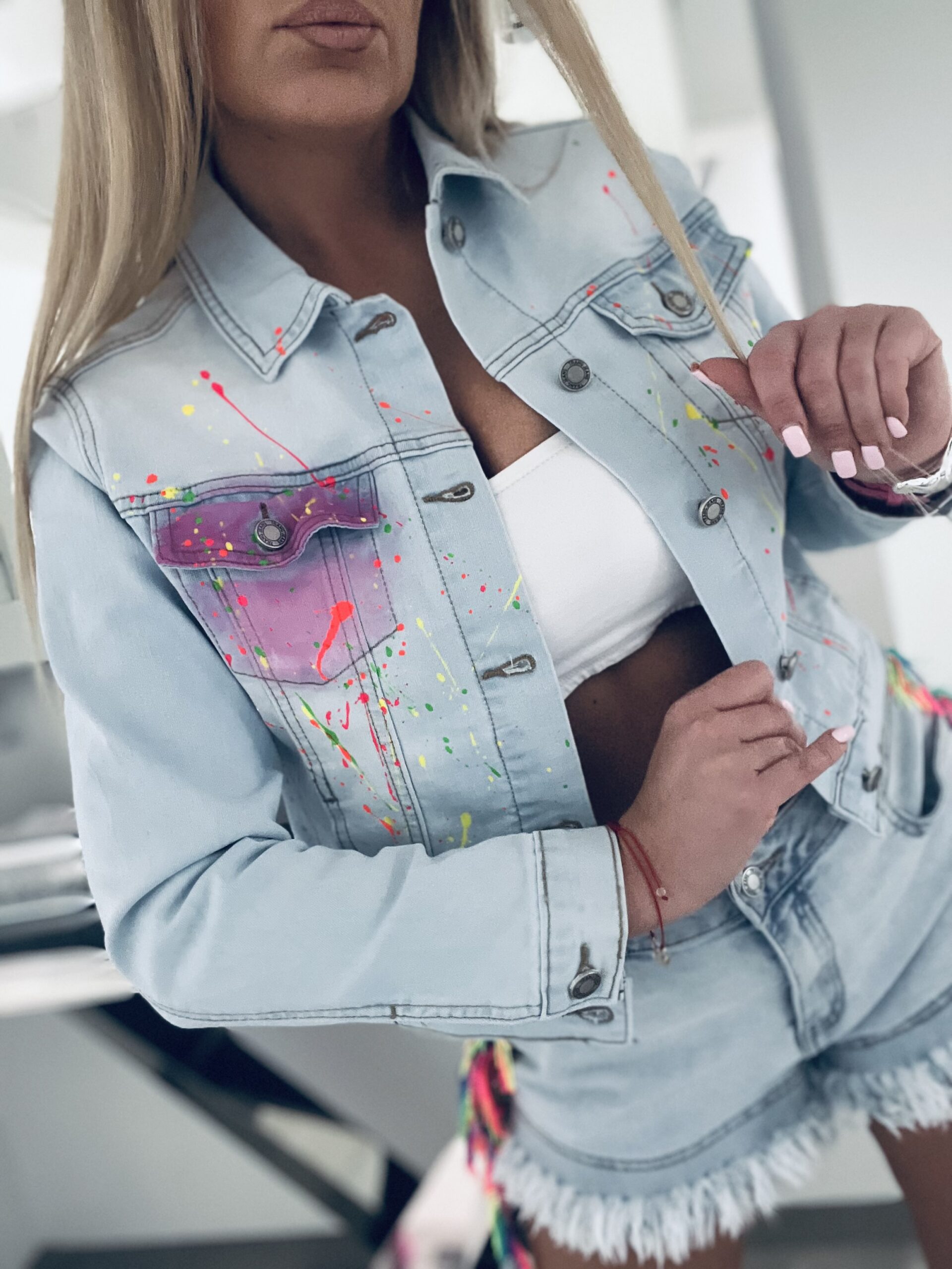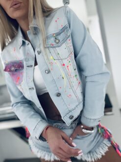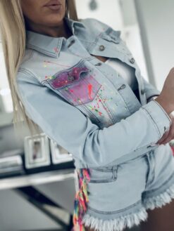Genialny model jeansowej kurtki którą pokochasz od pierwszego wejrzenia. Świetny dopasowany krój oraz charakterystyczne nakrapiane neonowe plamki z przodu. Idealnie leży i układa się na sylwetce. Kurtka wykonana z miękkiego elastycznego jeansu. Przepiękny jasny odcień który doskonale wpasuje się w wiosenne trendy. Z tym modelem wystylizujesz się na MAXA ! Dodatkowo całą robotę tworzy unikatowy tył – motyw DAISY&DONALDA. Kurtka robię niesamowite wrażenie dzięki swojemu wykonaniu które z pewnością jest oryginalne i nietuzinkowe.