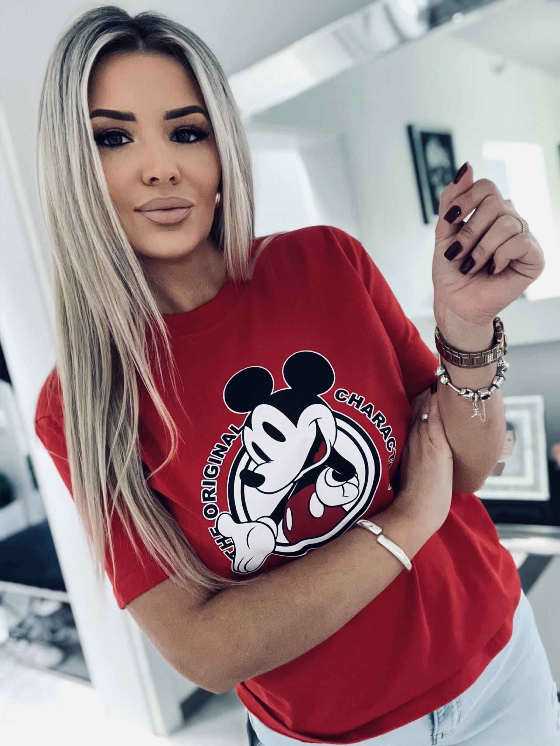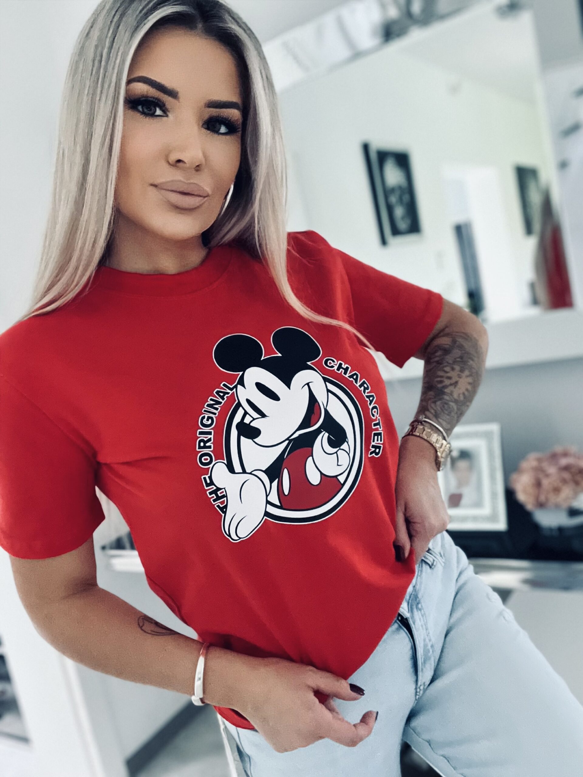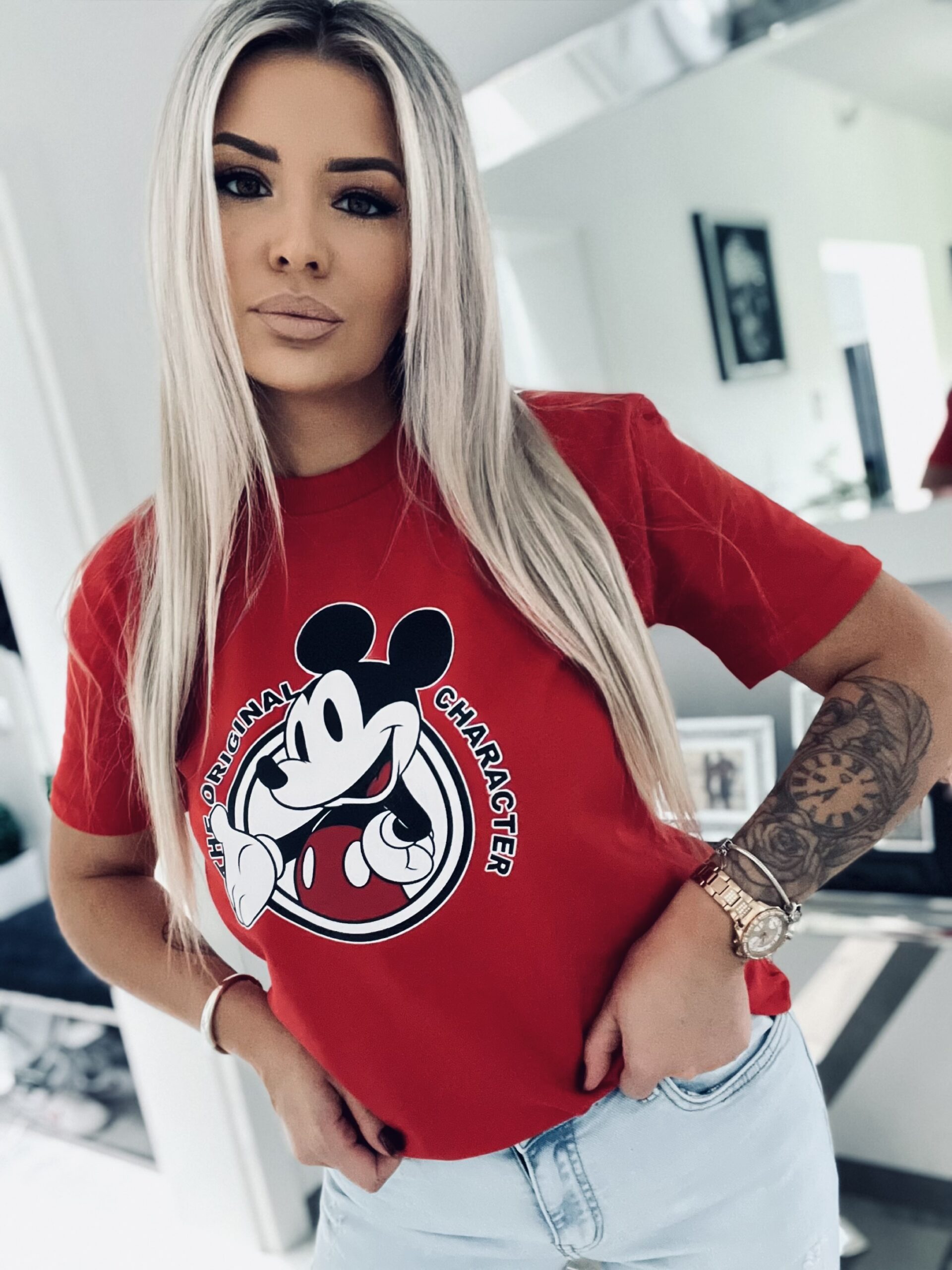Klasyczny t-shirt w kolorze pięknej czerwieni. Wykonany z najwyższej jakości bawełny z dodatkiem elastanu. Świetny model z charakterystycznym dużym bajkowym nadrukiem z przodu. Klasyczny krój wykończony okrągłym dekoltem . Bluzeczka którą założysz co codziennych stylizacji, z pewnością zrobię ogromne wrażenie dzięki swojemu kolorowi i niepowtarzalnemu nadrukowi .