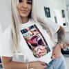 Klasyczny t-shirt w kolorze śnieżno białym . Wykonany z najwyższej jakości bawełny z dodatkiem elastanu. Świetny model z charakterystycznym dużym nadrukiem z przodu.Klasyczny krój wykończony okrągłym dekoltem . Bluzeczka którą założysz co codziennych stylizacji, z pewnością zrobi ogromne wrażenie dzięki swojem u niepowtarzalnemu nadrukowi .